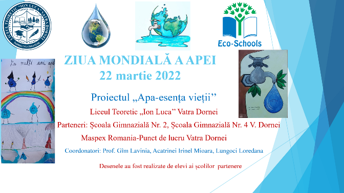 Apa- esența vieții, proiect dedicat Zilei mondiale a apei- 22 martie 2022, inclus în Planul de activități al Programului Mondial Eco- Școala, a adus împreună elevi ai Liceului Teoretic ,,Ion Luca” Vatra Dornei, implicați în activități desfășurate în săptămâna 21-25 martie 2022.